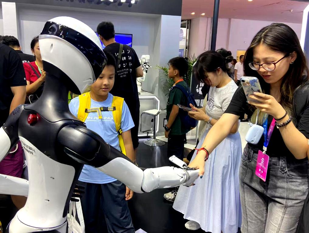 8日、2025世界ロボット大会の会場で、ロボットと握手をする女性。(北京=新華社記者/魏夢佳)