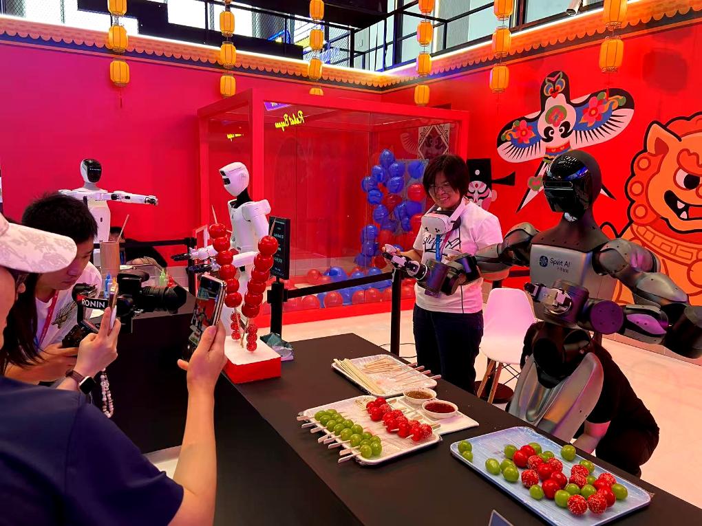 8日、2025世界ロボット大会の会場で、果実を使ったあめ菓子「糖葫蘆(タンフールー)」作りを実演するロボット。(北京=新華社記者/魏夢佳)