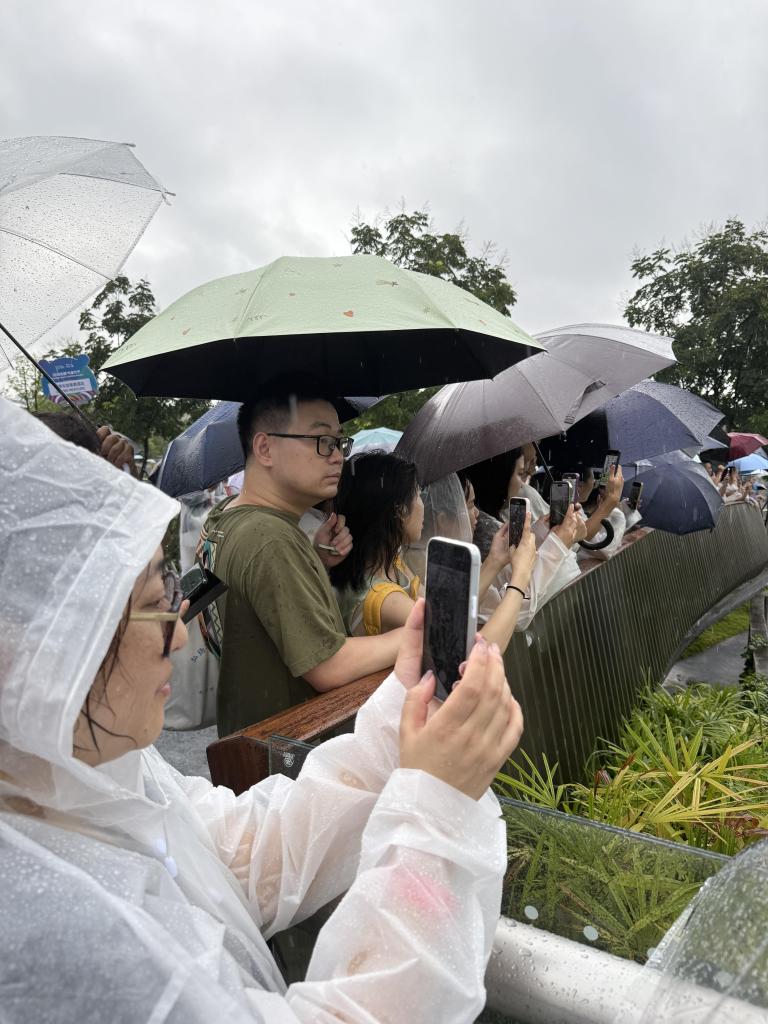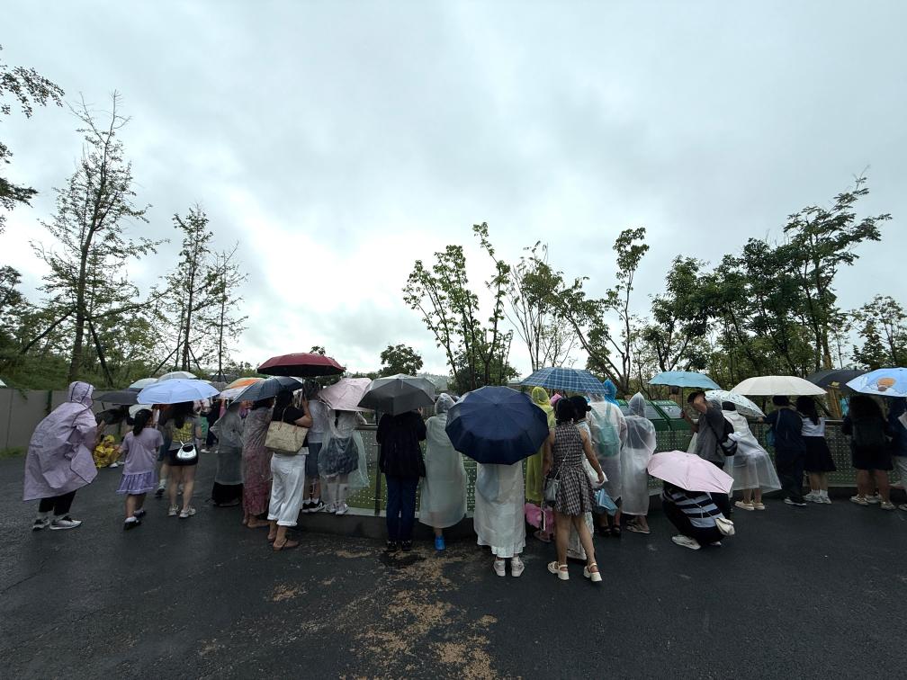 10日、雨の中でパンダを撮影する観光客。(成都=新華社記者/許芸潁)