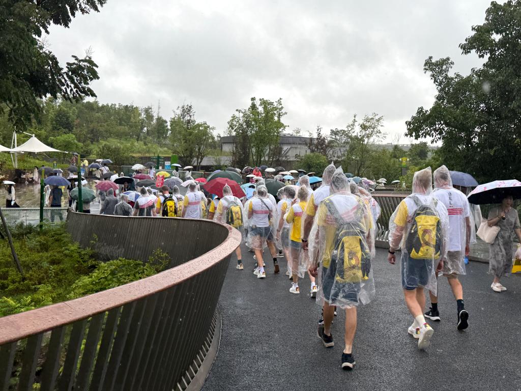 10日、雨の中で成都ジャイアントパンダ繁殖研究基地を見学するベルギーの選手たち。(成都=新華社記者/許芸潁)