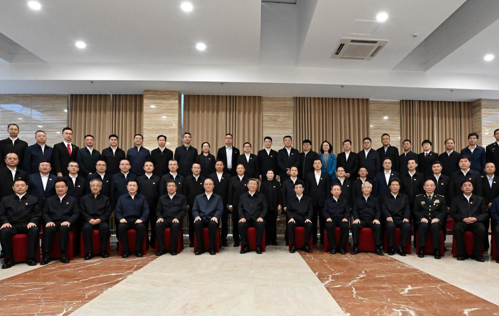 20日、西蔵自治区および関係部門、各地区・市の責任者や元幹部の代表と記念撮影する習近平氏(最前列中央)。(ラサ=新華社記者/燕雁)
