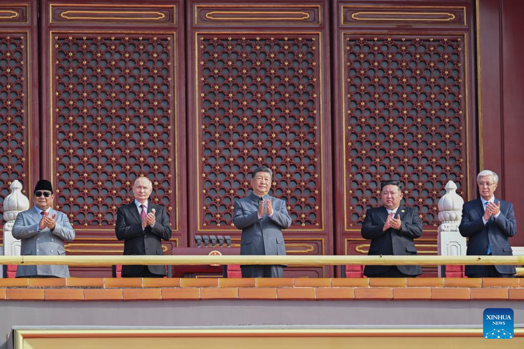 中国人民抗日戦争・世界反ファシズム戦争勝利80周年記念大会は3日、北京で盛大に行われた。写真は天安門城楼の上に立つ習近平(しゅう・きんぺい)中国共産党中央委員会総書記・国家主席・中央軍事委員会主席ら。(北京=新華社記者/岳月偉)
