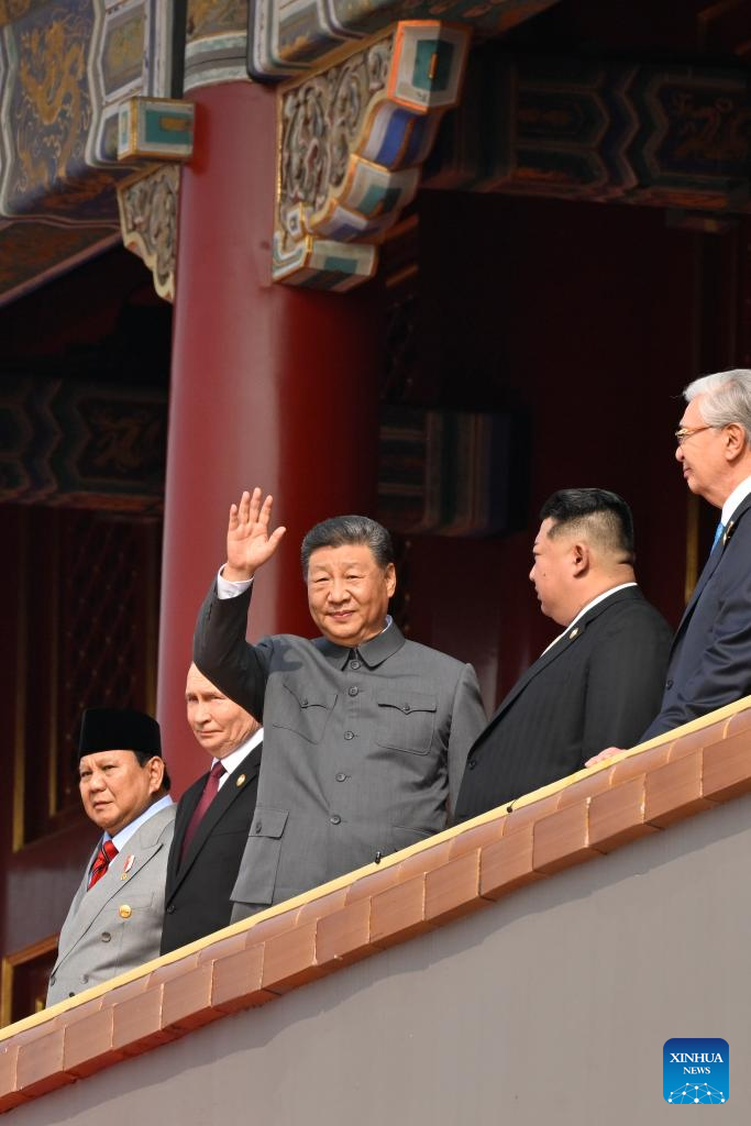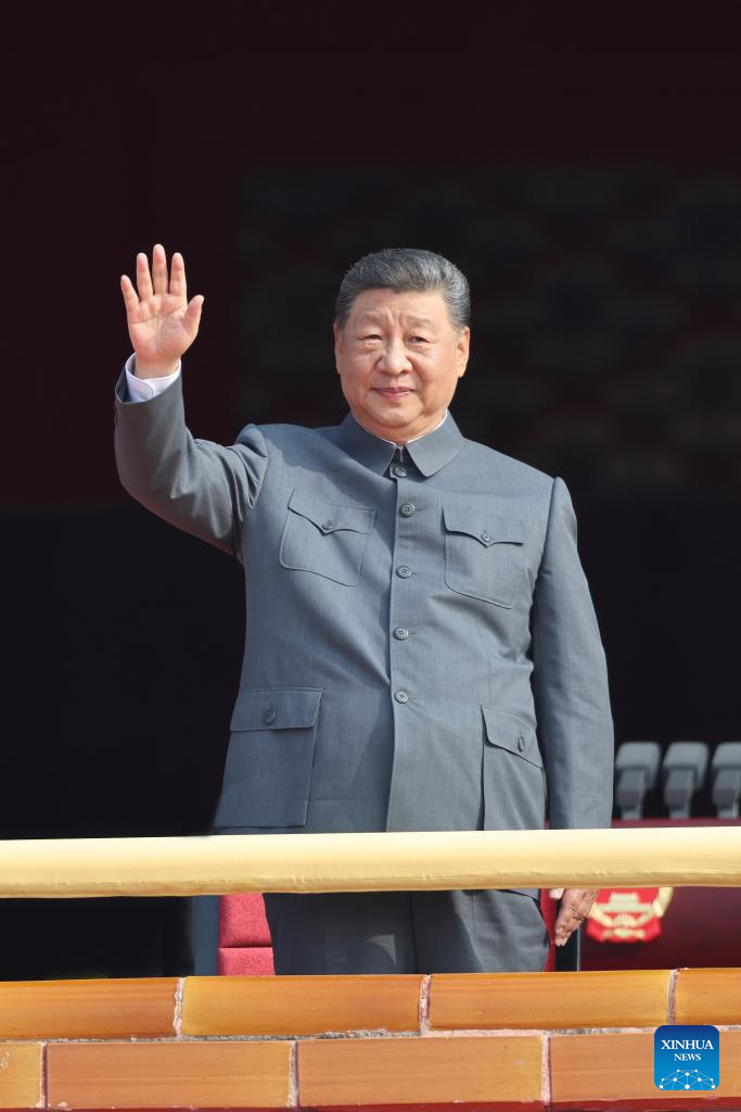 中国人民抗日戦争・世界反ファシズム戦争勝利80周年記念大会は3日、北京で盛大に行われた。写真は天安門城楼で手を振る習近平(しゅう・きんぺい)中国共産党中央委員会総書記・国家主席・中央軍事委員会主席。(北京=新華社記者/岳月偉)