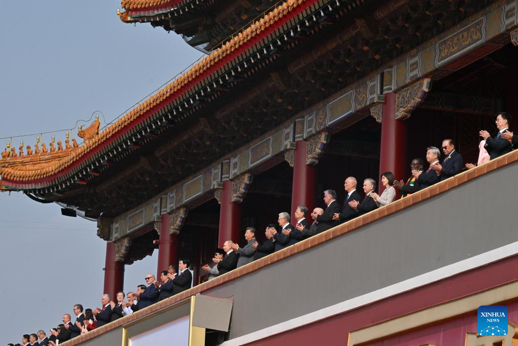 中国人民抗日戦争・世界反ファシズム戦争勝利80周年記念大会は3日、北京で盛大に行われた。写真は天安門城楼の上に立つ習近平(しゅう・きんぺい)中国共産党中央委員会総書記・国家主席・中央軍事委員会主席ら。(北京=新華社記者/饒愛民)