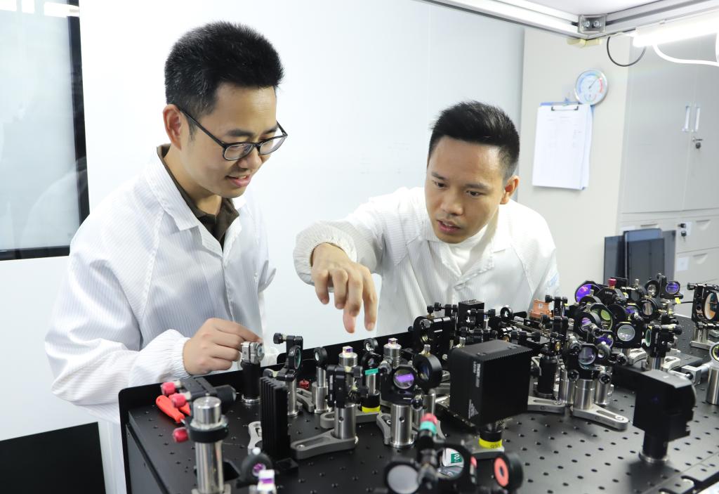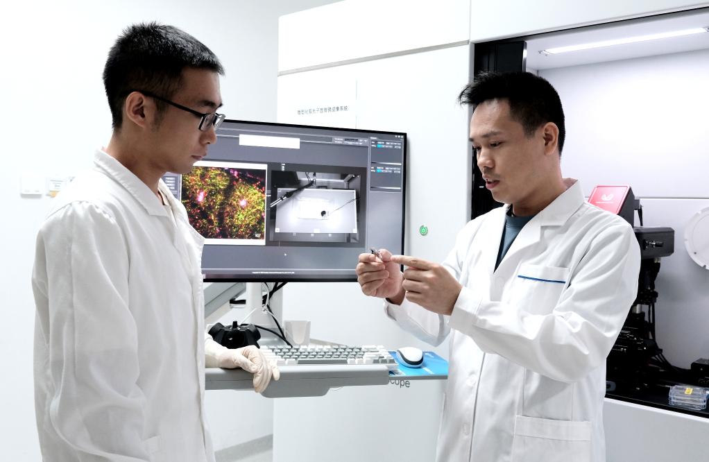 8月20日、北京大学未来技術学院の実験室で、多色小型2光子顕微鏡の応用について学生と議論する北京信息科技大学の呉潤竜氏(右)。(北京=新華社配信)