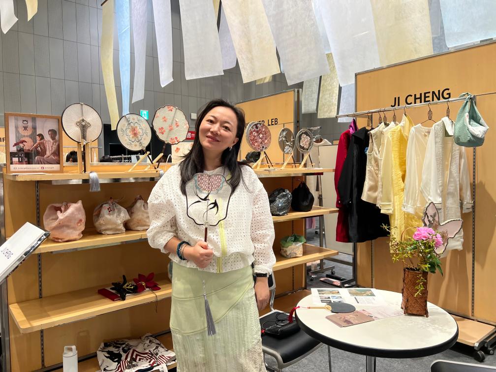 中国人デザイナーの吉承(きつ・しょう)さんは、服や中国うちわなどを出展。伝統絹織物「宋錦」や敦煌壁画などの伝統的図案から着想を得て、蘇州の伝統刺繡「蘇繡」の絹糸を用いて伝統工芸と現代ファッションを融合させた。