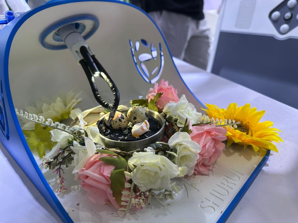 13日、2025年中国国際サービス貿易交易会で、ウズラの卵の殻をむくデモンストレーションを行う北京術鋭機器人の「術鋭腔鏡手術ロボット」。(北京=新華社記者/邱虹)