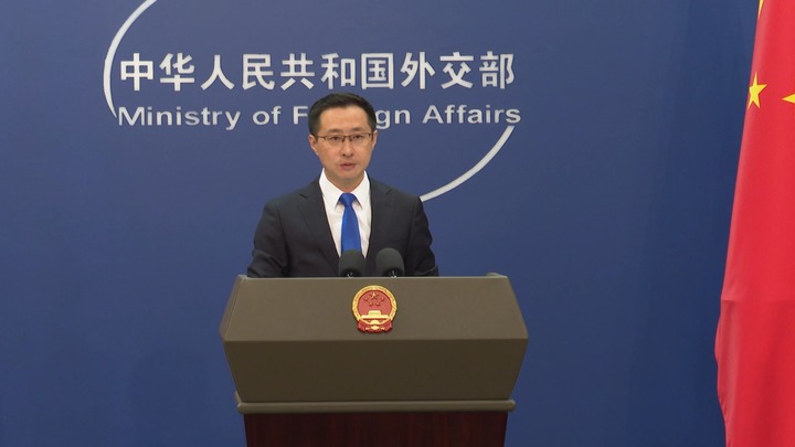 記者会見に臨む中国外交部の林剣報道官。(北京=新華社配信)