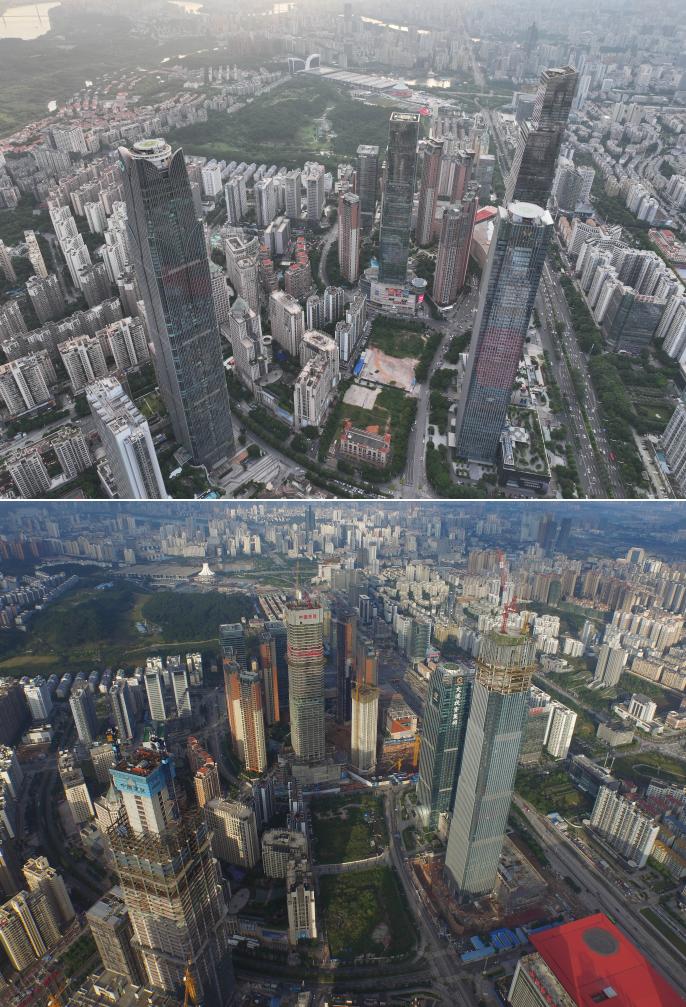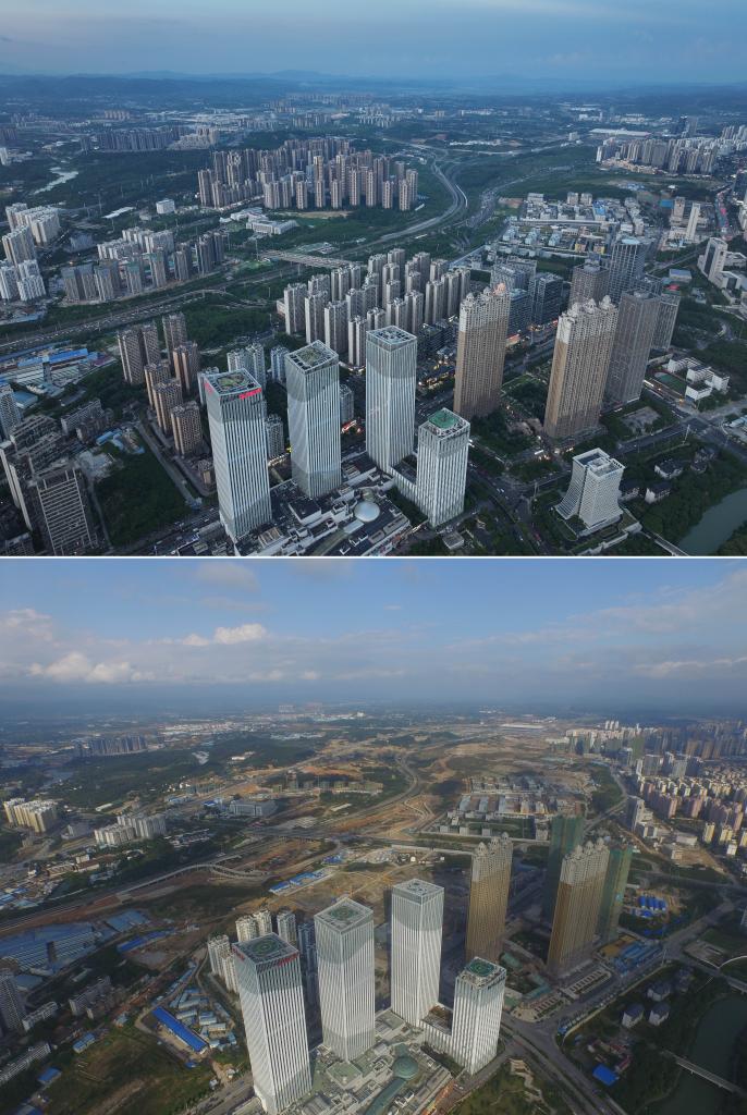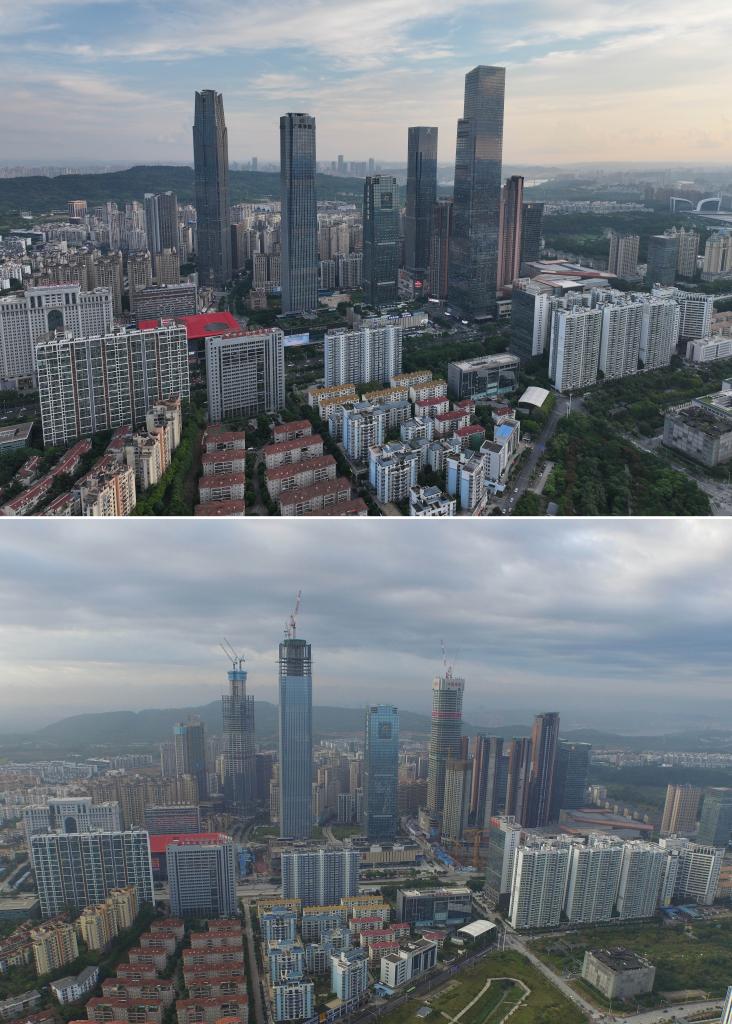 南寧市を走る青環路一帯の建物の10年前と現在の様子。(上:9月6日撮影、下:2015年8月13日撮影、いずれもドローンから、南寧=新華社記者/黄孝邦)