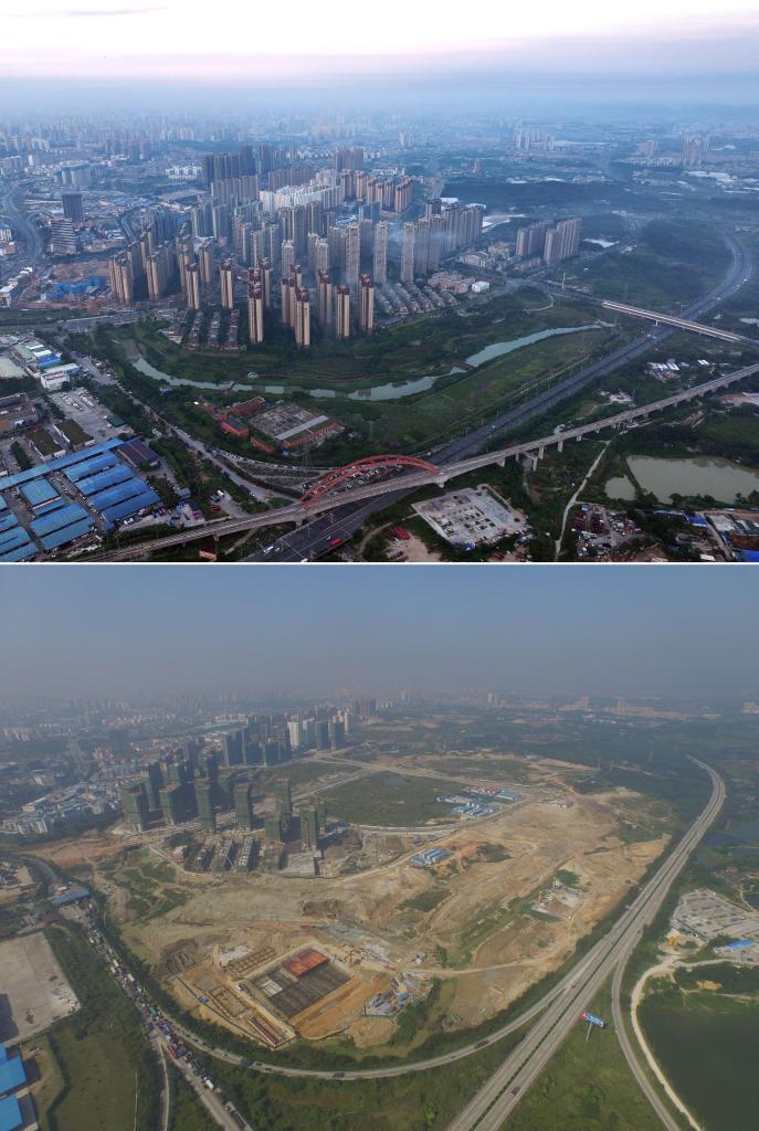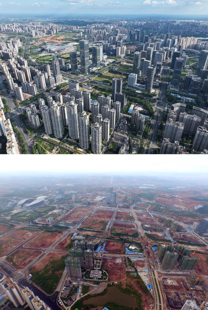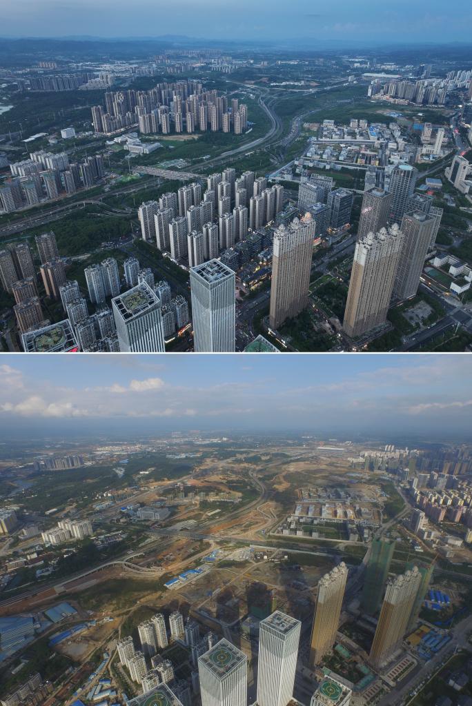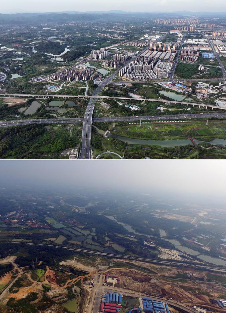 南寧市五象新区の10年前と現在の様子。(上:9月6日撮影、下:2015年8月13日撮影、いずれもドローンから、南寧=新華社記者/黄孝邦)