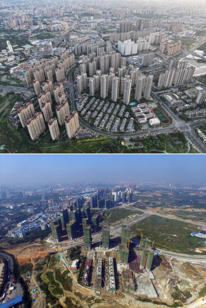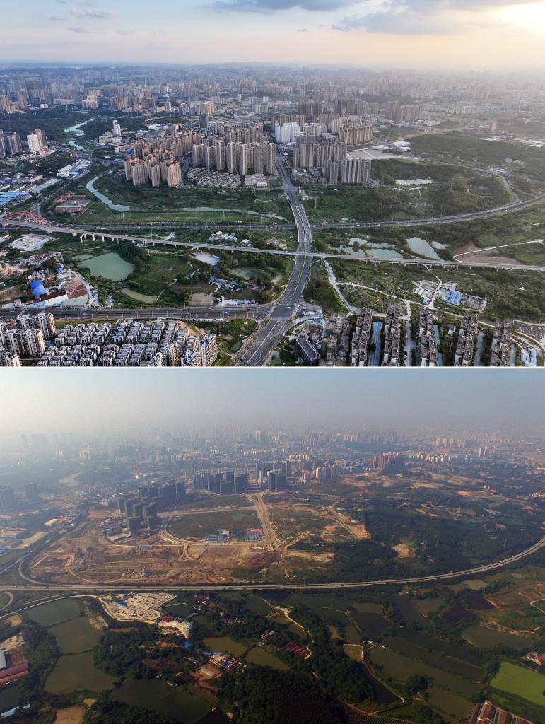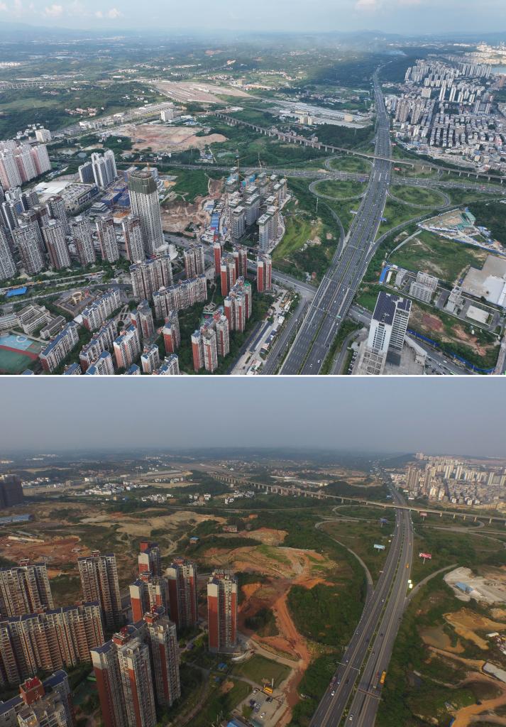 南寧市を走る那安自動車専用道路の両側に立つ建物の10年前と現在の様子。(上:9月6日撮影、下:2015年8月10日撮影、いずれもドローンから、南寧=新華社記者/黄孝邦)