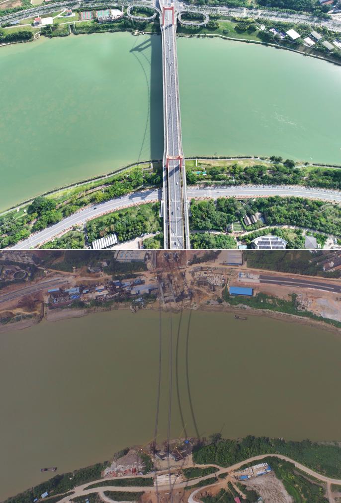 南寧市にある良慶大橋の建設前と完成後の様子。(上:9月6日撮影、下:2015年8月13日撮影、いずれもドローンから、南寧=新華社記者/黄孝邦)