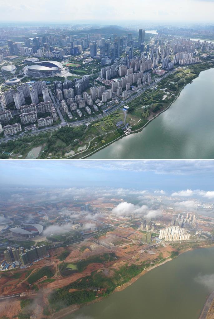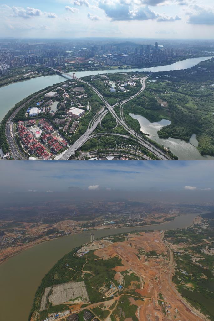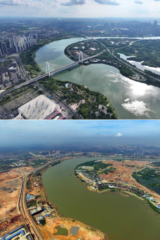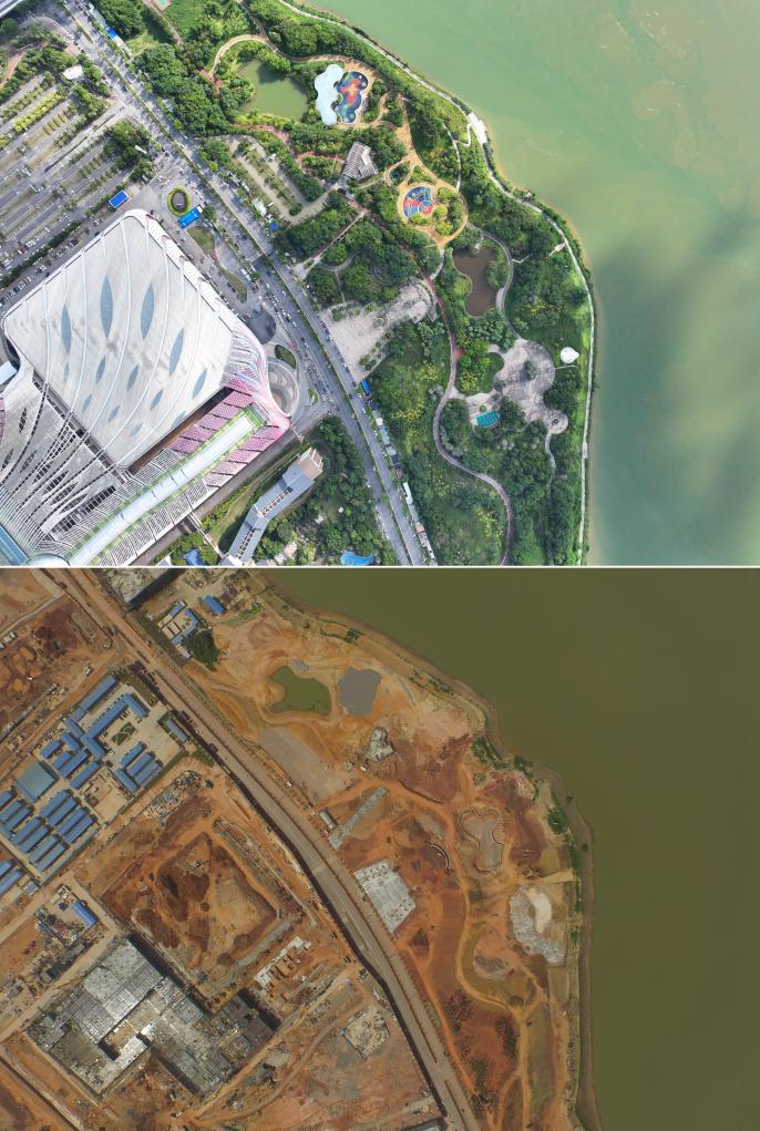 南寧市五象新区の川沿いに整備された公園の建設前と現在の様子。(上:現在、9月6日撮影、下:建設前:2015年8月13日撮影、いずれもドローンから、南寧=新華社記者/黄孝邦)