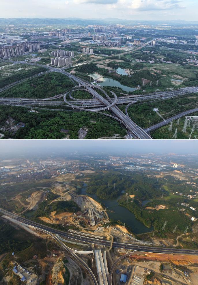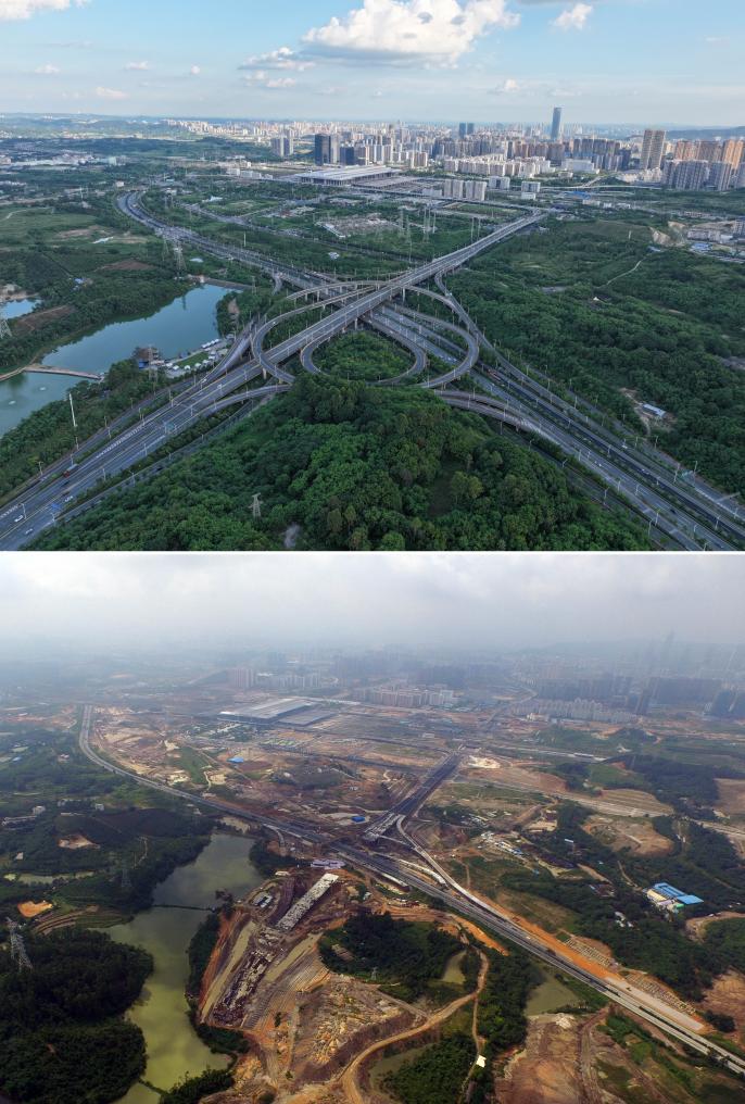 南寧東駅近くにある北鳳高架橋の建設中と現在の様子。(上:現在、9月6日撮影、下:建設中:2015年8月15日撮影、いずれもドローンから、南寧=新華社記者/黄孝邦)