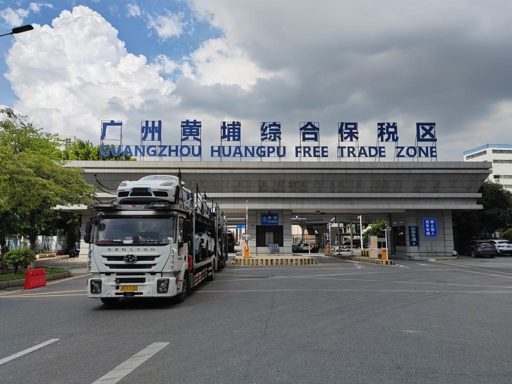 16日、ドイツから輸入されたポルシェを満載して、広東省広州市の黄埔総合保税区を出発する車両運搬車。(広州=新華社配信)