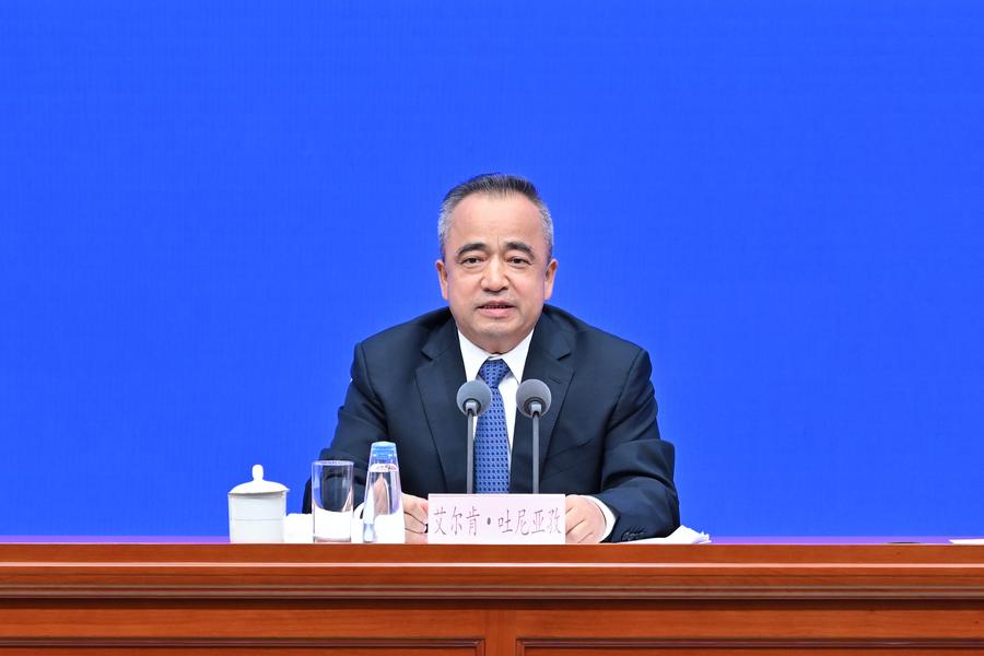 19日、記者会見で関連状況を紹介するエルキン・トゥニヤズ氏。(北京=新華社記者/李鑫)