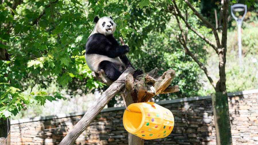 【新華社成都9月20日】中国四川省のパンダ保護研究センター臥竜神樹坪基地でこのほど、パンダの「小奇跡(シャオチージー)」が木で組まれた遊具に登ってタケノコを食べる姿が撮影された。