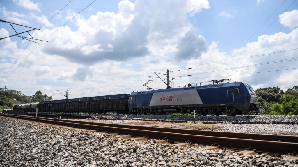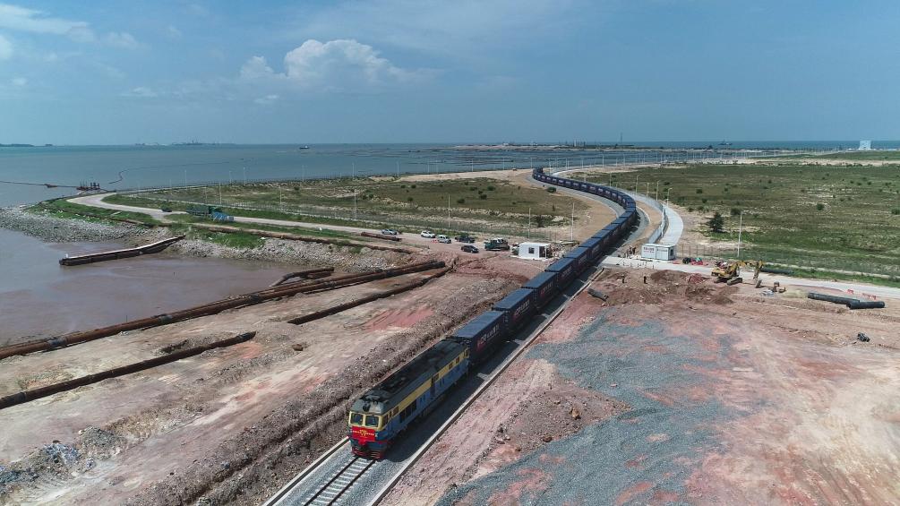 西部陸海新ルートを走る陸海複合一貫輸送の列車。(2021年9月3日撮影、南寧=新華社記者/張愛林)
