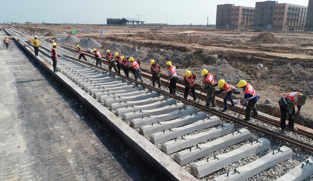 欽州港東駅拡張工事のレール敷設作業。(2019年6月27日撮影、南寧=新華社記者/張愛林)
