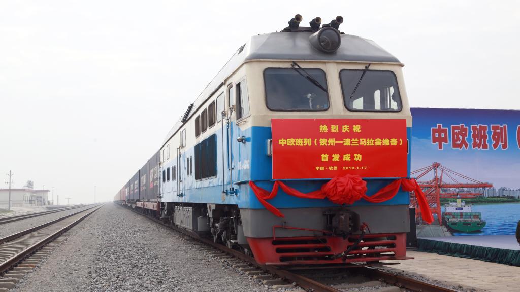 欽州港東駅から出発する「中欧班列」(中国と欧州を結ぶ国際定期貨物列車)欽州-ポーランド・マワシェビチェ線の第1便。(2018年1月17日撮影、南寧=新華社記者/張愛林)