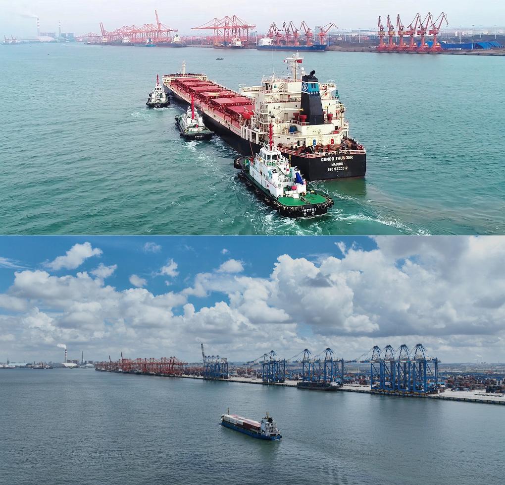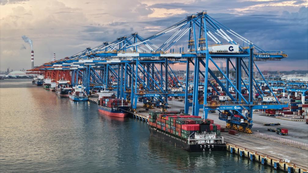 16日、欽州港のふ頭で荷降ろしする貨物船。(ドローンから、南寧=新華社記者/張愛林)