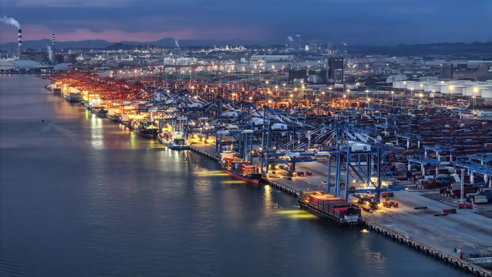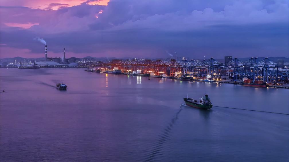 16日、夕暮れ時の欽州港を行き交う貨物船。(ドローンから、南寧=新華社記者/張愛林)
