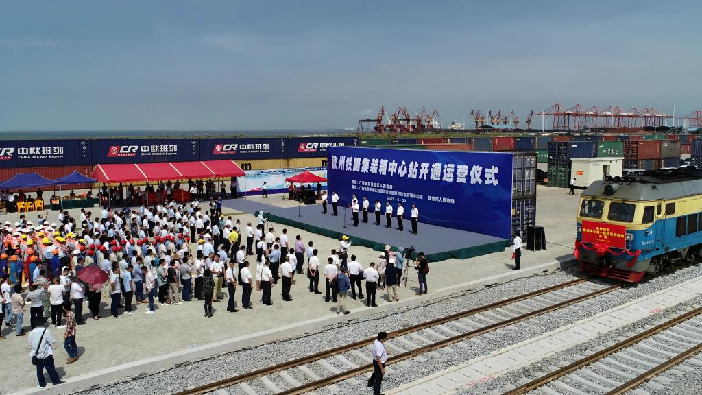 欽州鉄道コンテナセンター駅の稼動式。(2019年6月30日、ドローンから、南寧=新華社記者/張愛林)