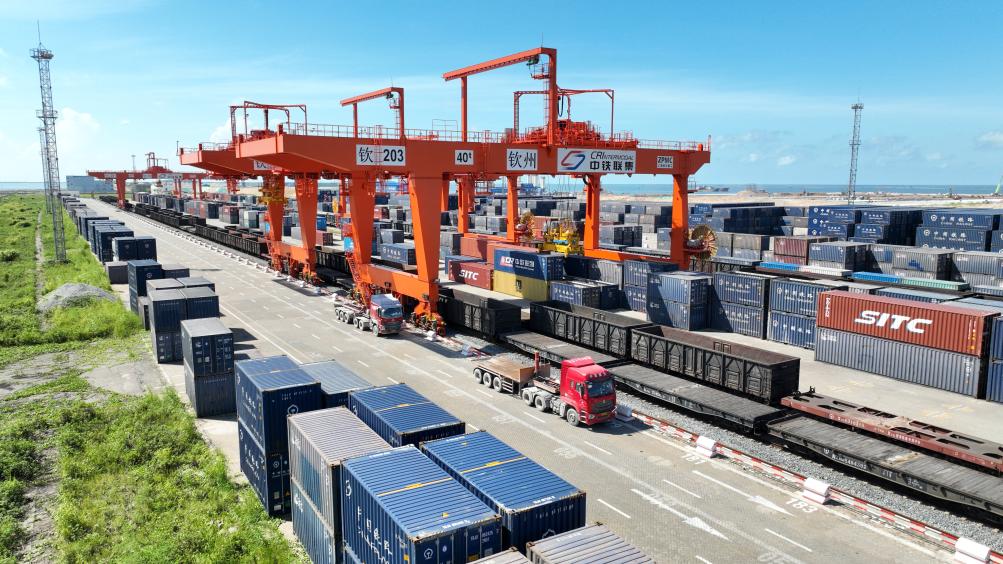 【新華社南寧9月21日】中国重慶市から広西チワン族自治区を経てシンガポールに至る輸送ルートの地上輸送を担う国際貨物列車「渝桂新」班列は、2017年4月28日に同自治区の欽州港東駅から重慶への試験列車が運行し、中国西部と東南アジアを結ぶ「西部陸海新ルート」の陸海複合一貫輸送の幕が開けた。自治区の北部湾港はこの8年、ゲートウエーとしてのハブ機能を急速に向上させ、陸海複合一貫輸送は西部陸海新ルートが果たす重要な役割を支えている。
