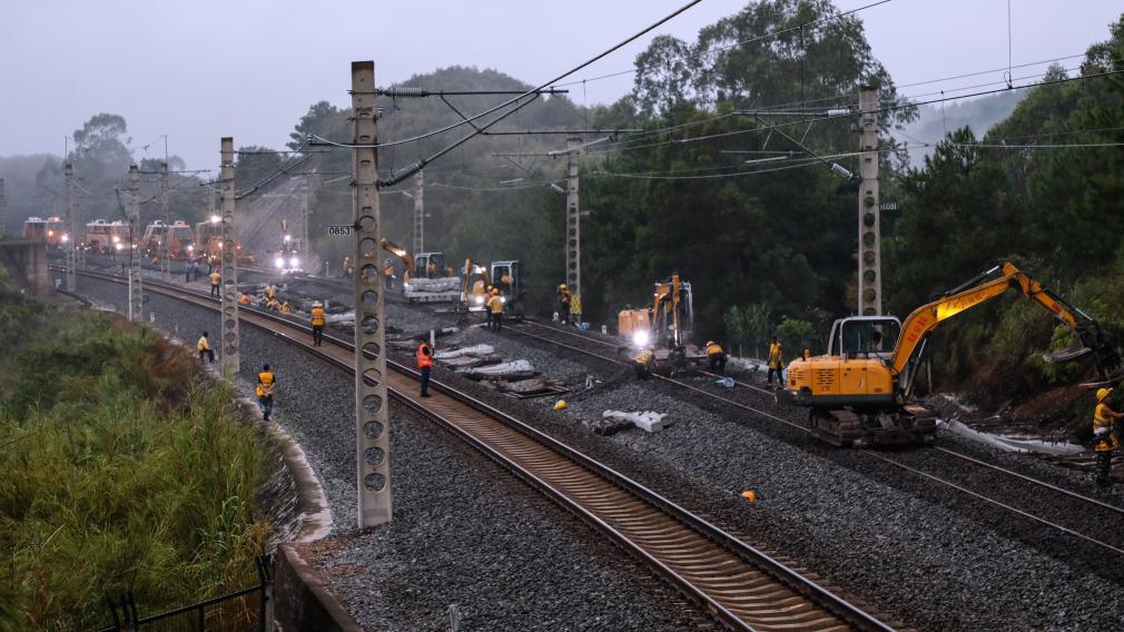 西部陸海新ルートのレール交換作業。(2021年9月2日撮影、南寧=新華社記者/張愛林)