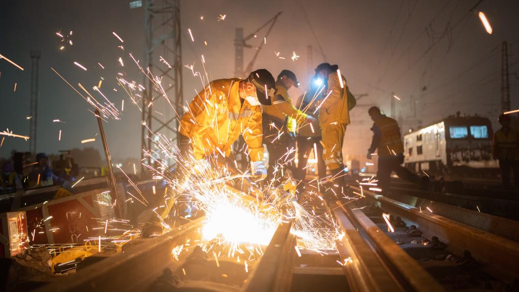 西部陸海新ルートのレールを交換する作業員。(2021年9月2日撮影、南寧=新華社記者/張愛林)