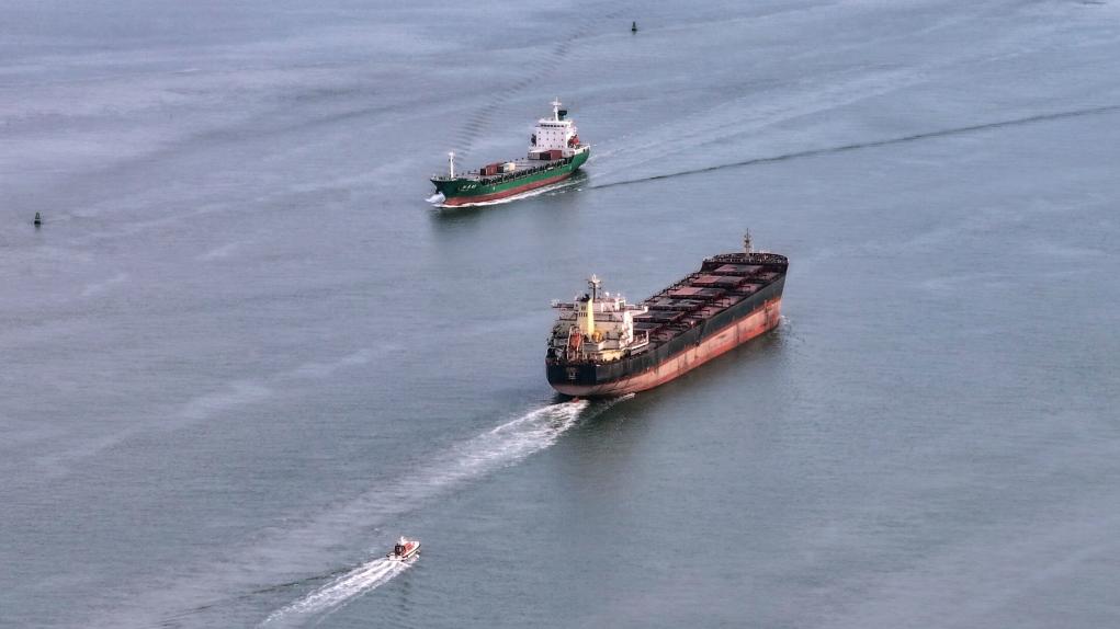 16日、欽州港を出港する貨物船。(ドローンから、南寧=新華社記者/張愛林)