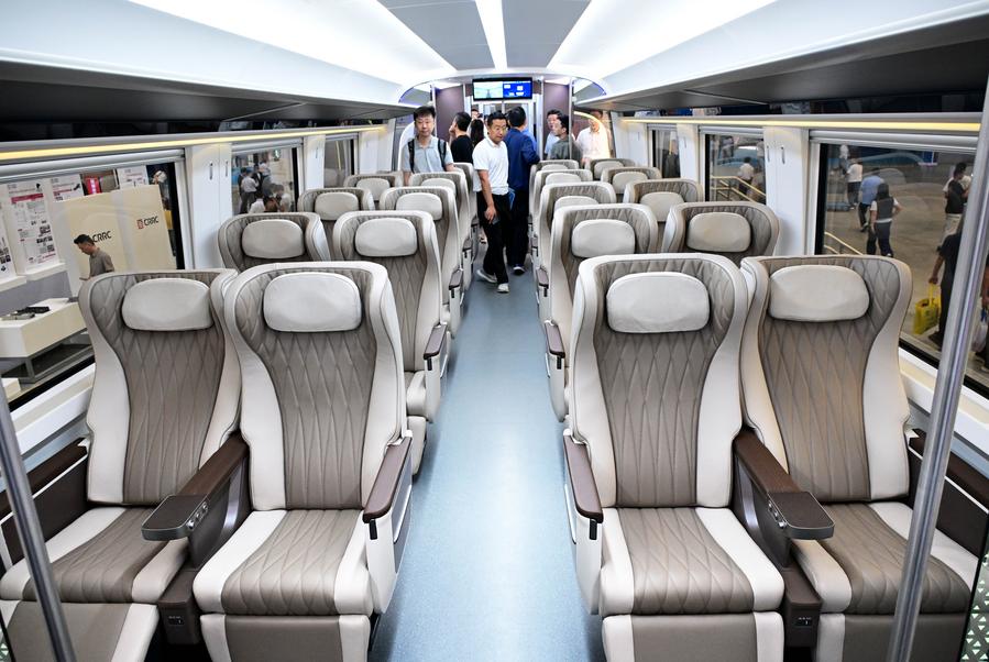 18日、都市間鉄道スマート列車の内部を見学する人たち。(青島=新華社記者/李紫恒)