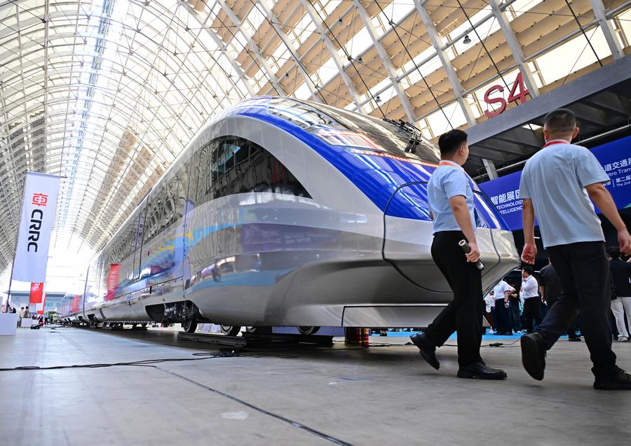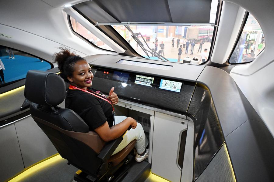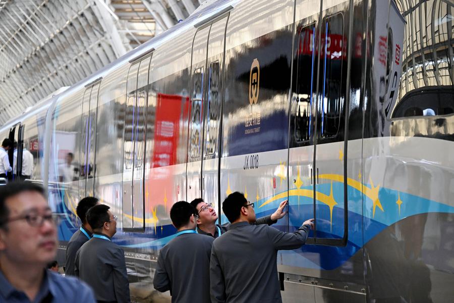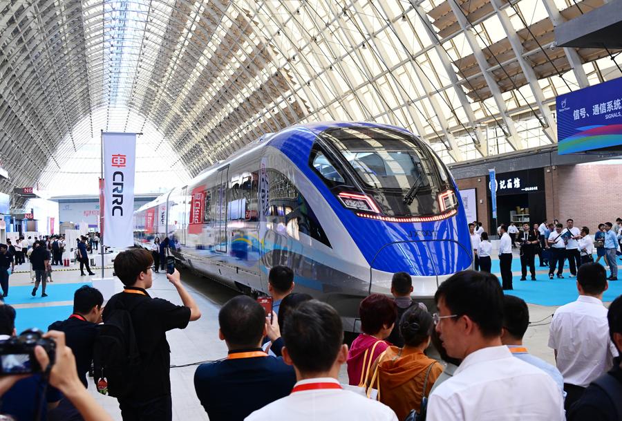 18日、中鉄青島世界博覧城で披露された都市間鉄道スマート列車。(青島=新華社記者/李紫恒)