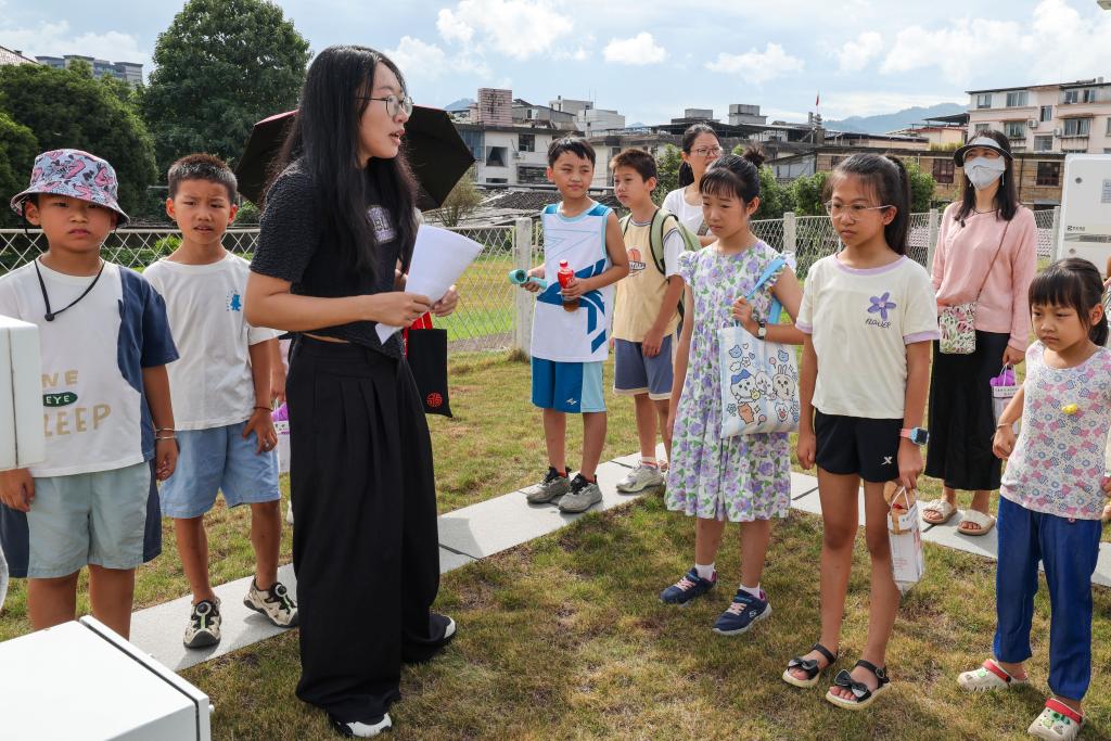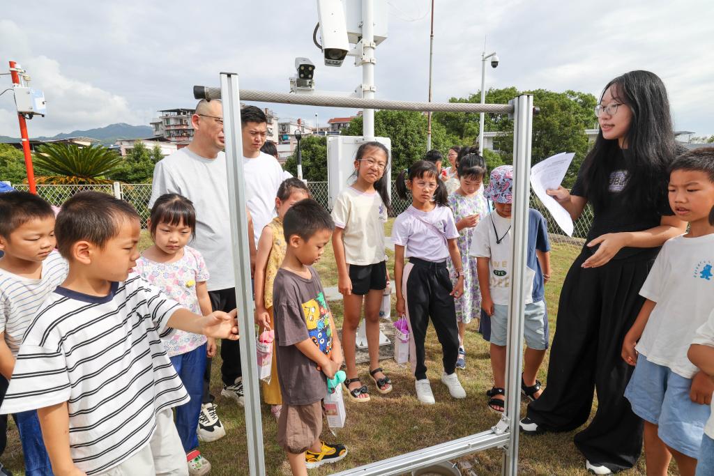 20日、気象観測所で風速計、雨量計、百葉箱などの仕組みを学ぶ親子連れ。(武夷山=新華社配信/邱汝泉)