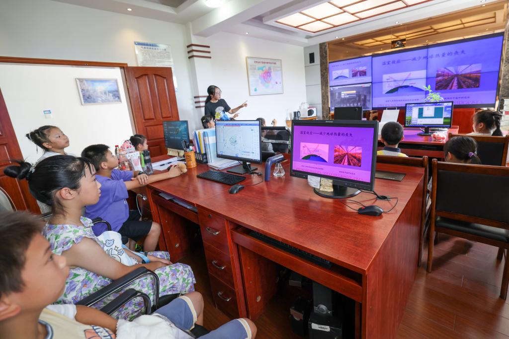 20日、気象会議室で短編映画を鑑賞し、天気予報作成会議を見学する子どもたち。(武夷山=新華社配信/邱汝泉)