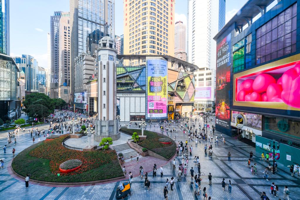 多くの観光客が訪れた重慶市渝中区の解放碑商業圏。(2024年8月23日撮影、重慶=新華社記者/王全超)