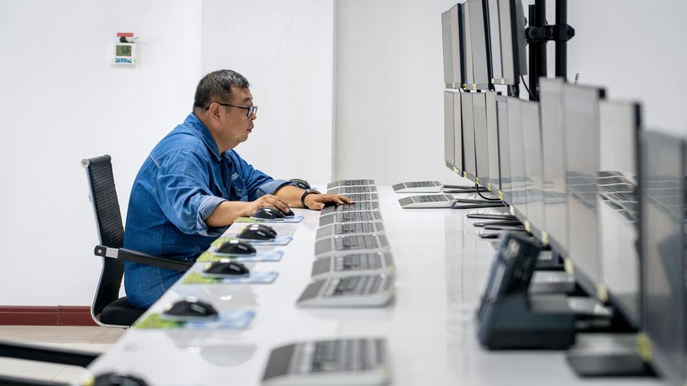 吉林省白城市通楡県什花道風力発電所の制御センターで風力発電機の運行データを確認する作業員。(8月26日撮影、長春=新華社記者/唐成卓)