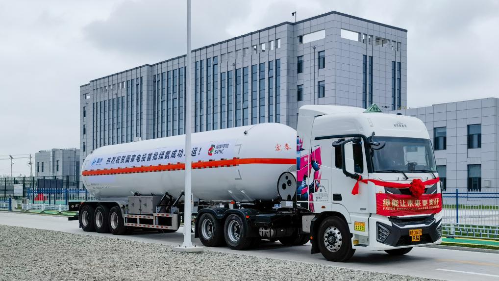 吉林省大安市にある大安風力・太陽光グリーン(環境配慮型)水素合成アンモニア一体化モデルプロジェクトで生産された初のグリーンアンモニアを積んだトラック。(7月26日撮影、長春=新華社配信)