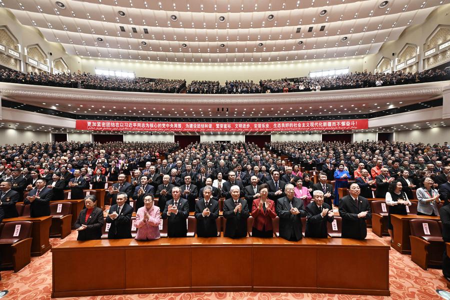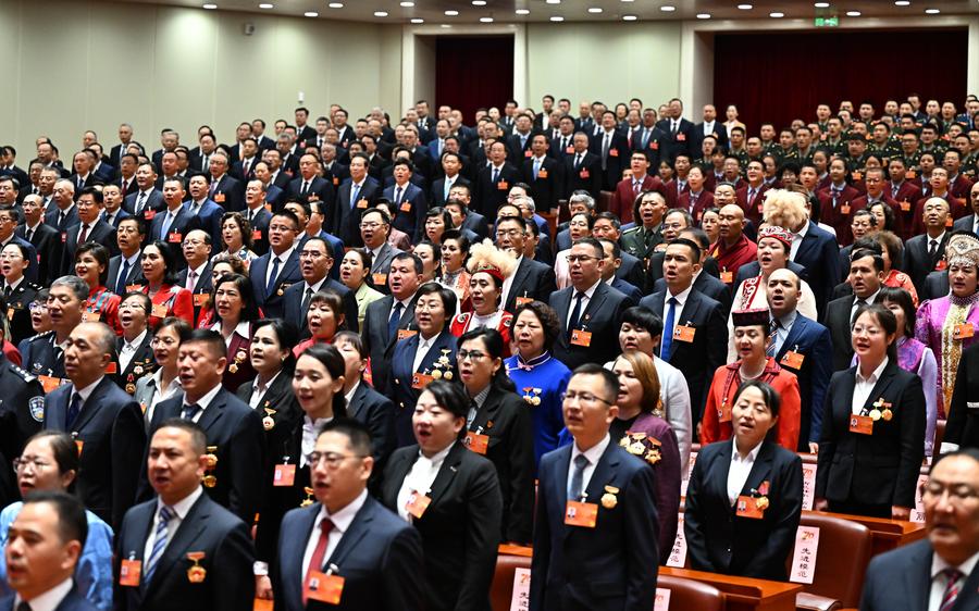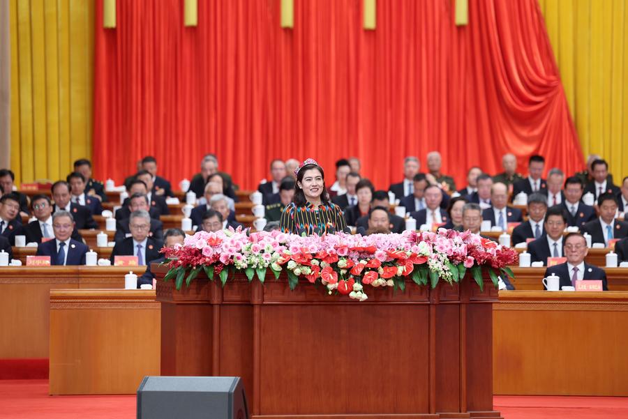 25日、ウルムチ市で開かれた新疆ウイグル自治区成立70周年の祝賀大会。(ウルムチ=新華社記者/申宏)