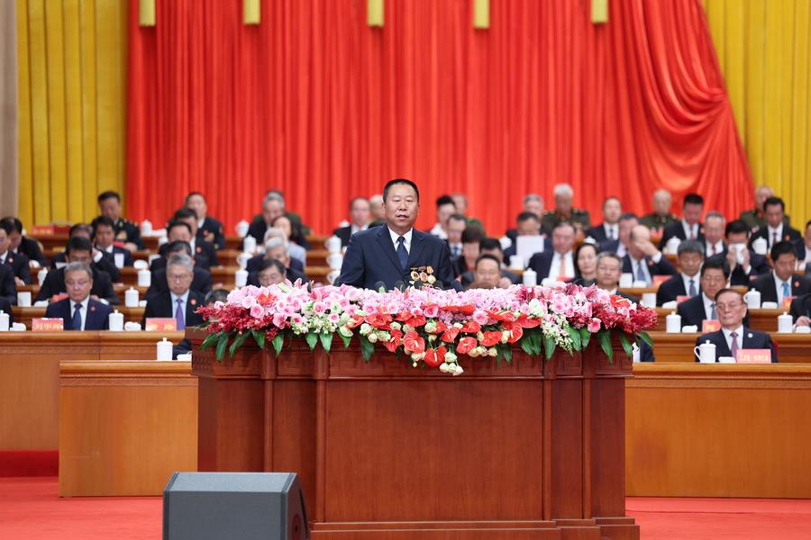 25日、祝賀大会で発言する新疆生産建設兵団の何忠友(か・ちゅうゆう)政治委員。(ウルムチ=新華社記者/姚大偉)