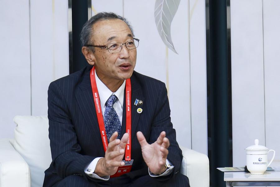 24日、江蘇省塩城市で開催された「世界沿岸フォーラム」の会場で、新華社のインタビューに応じる佐渡市の渡辺竜五市長。(塩城=新華社配信)
