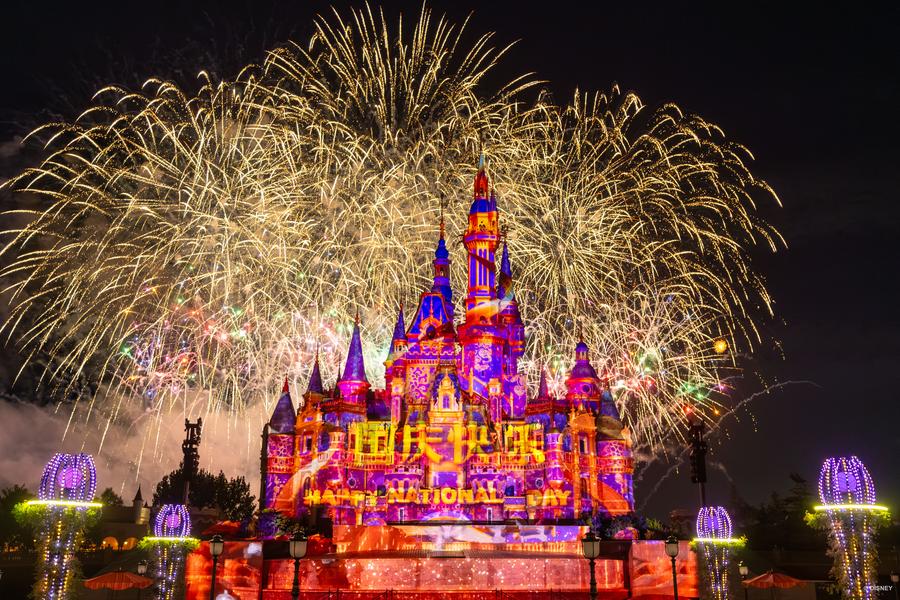 1日、上海ディズニーランドの「奇幻童話城」(エンチャンテッド・ストーリーブック・キャッスル)で実施された特別プロジェクションと花火ショー。(上海=新華社配信)