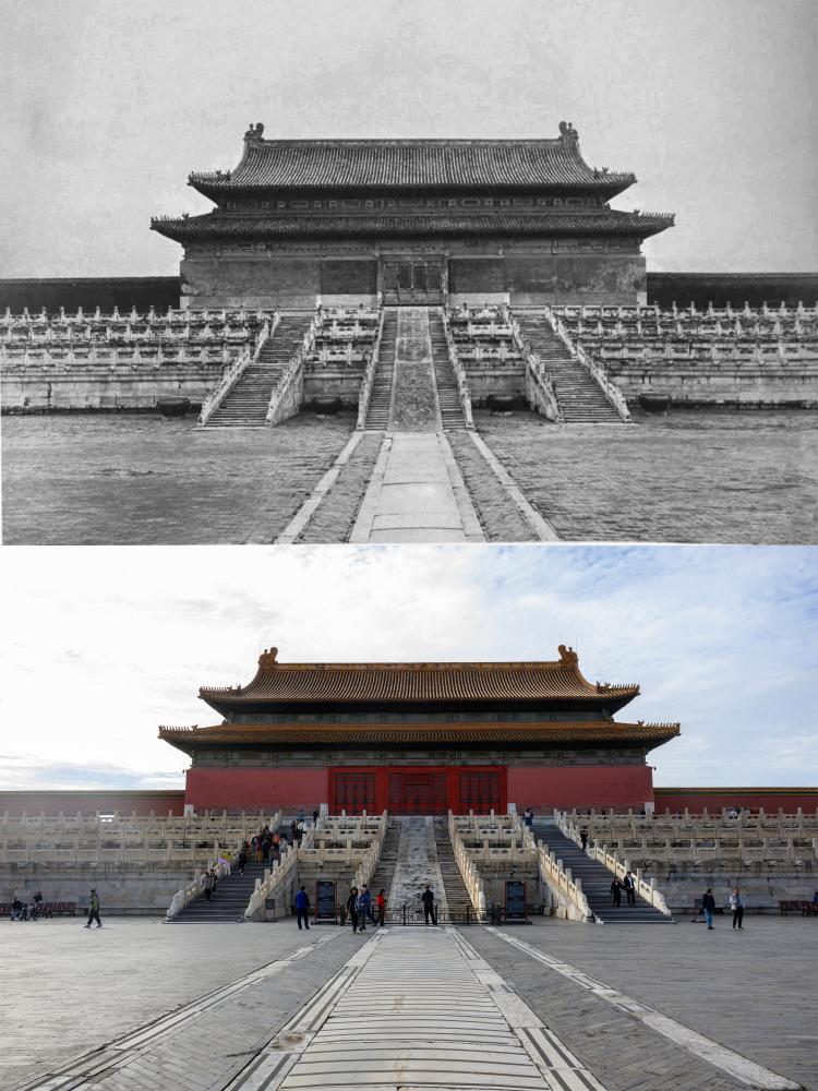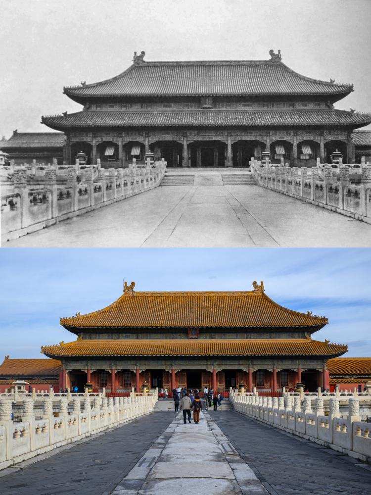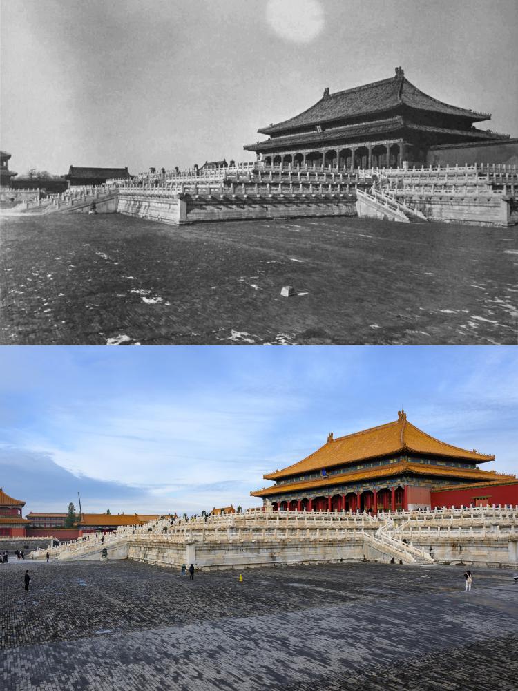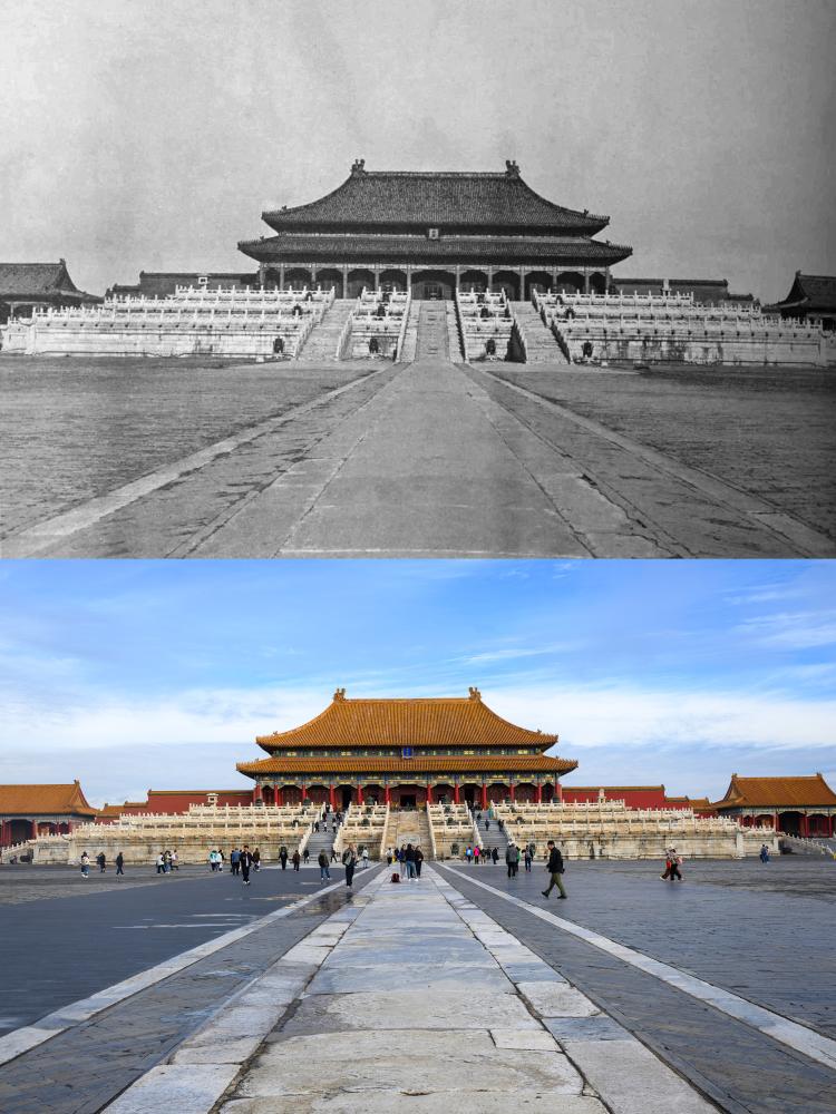 上:20世紀初頭の太和殿。(北京=新華社配信) 下:10日、故宮博物院の太和殿。(北京=新華社記者/金良快)