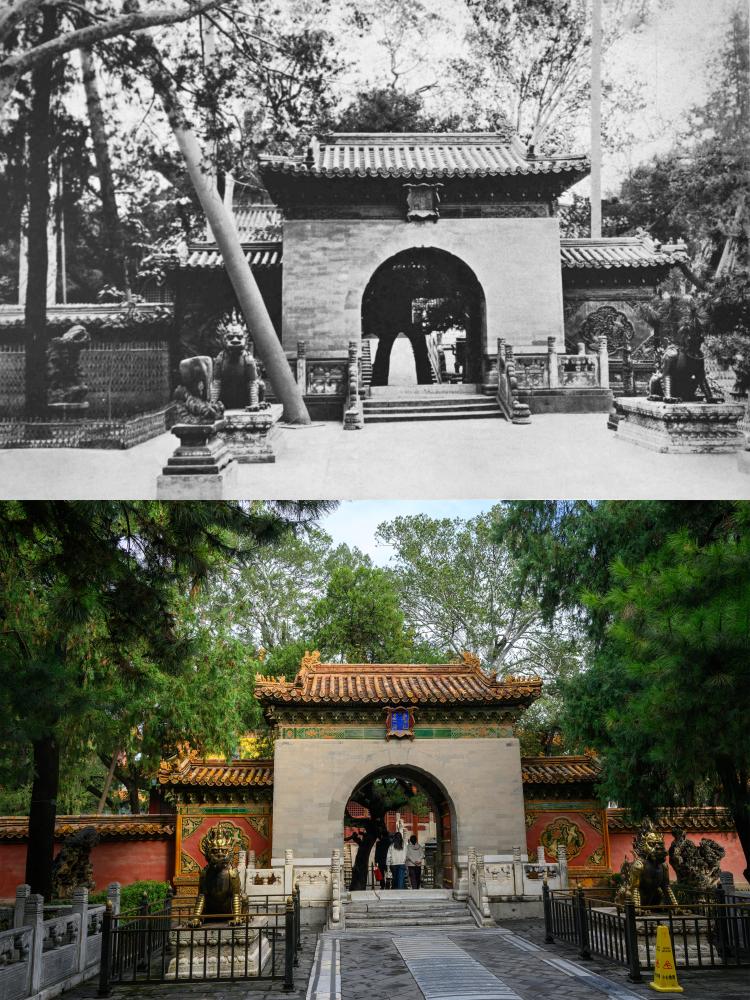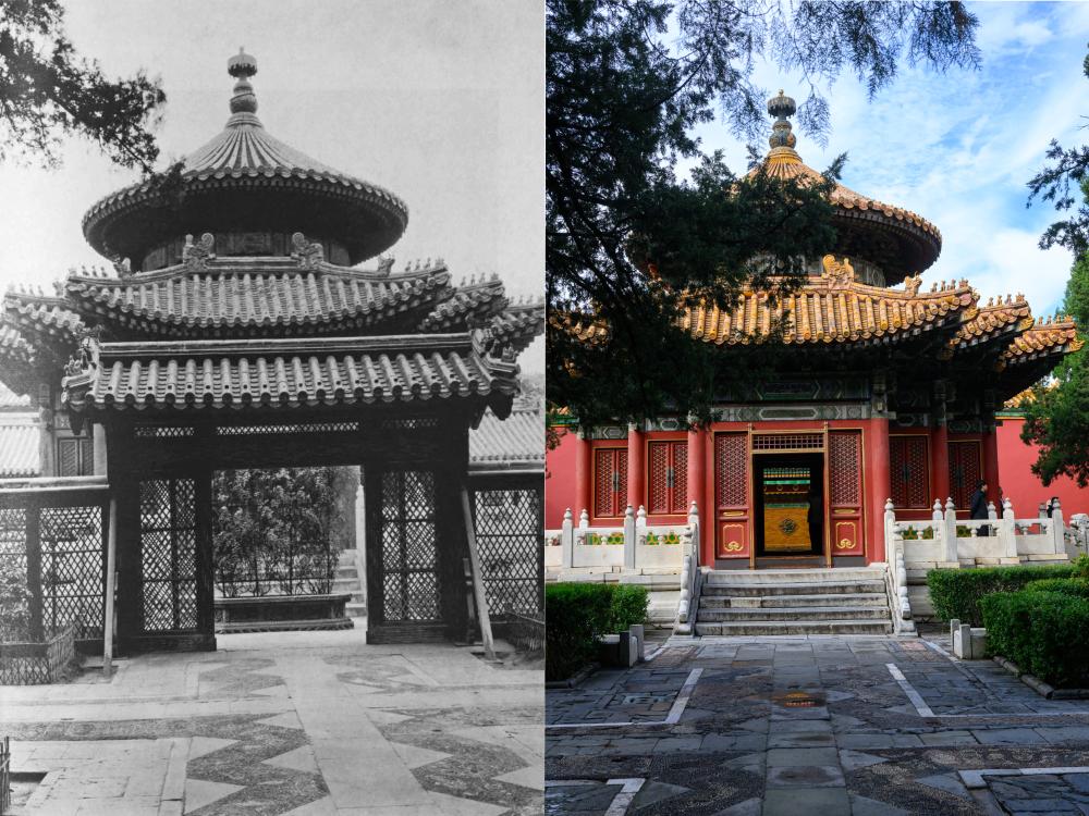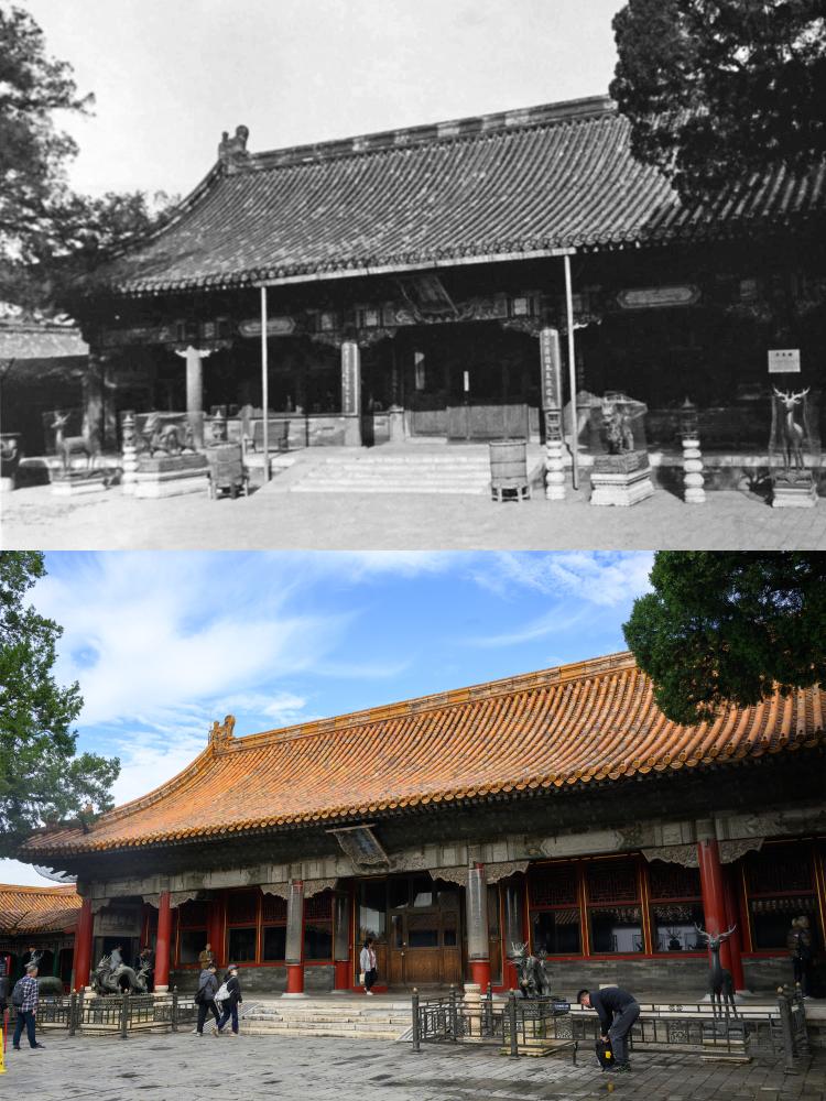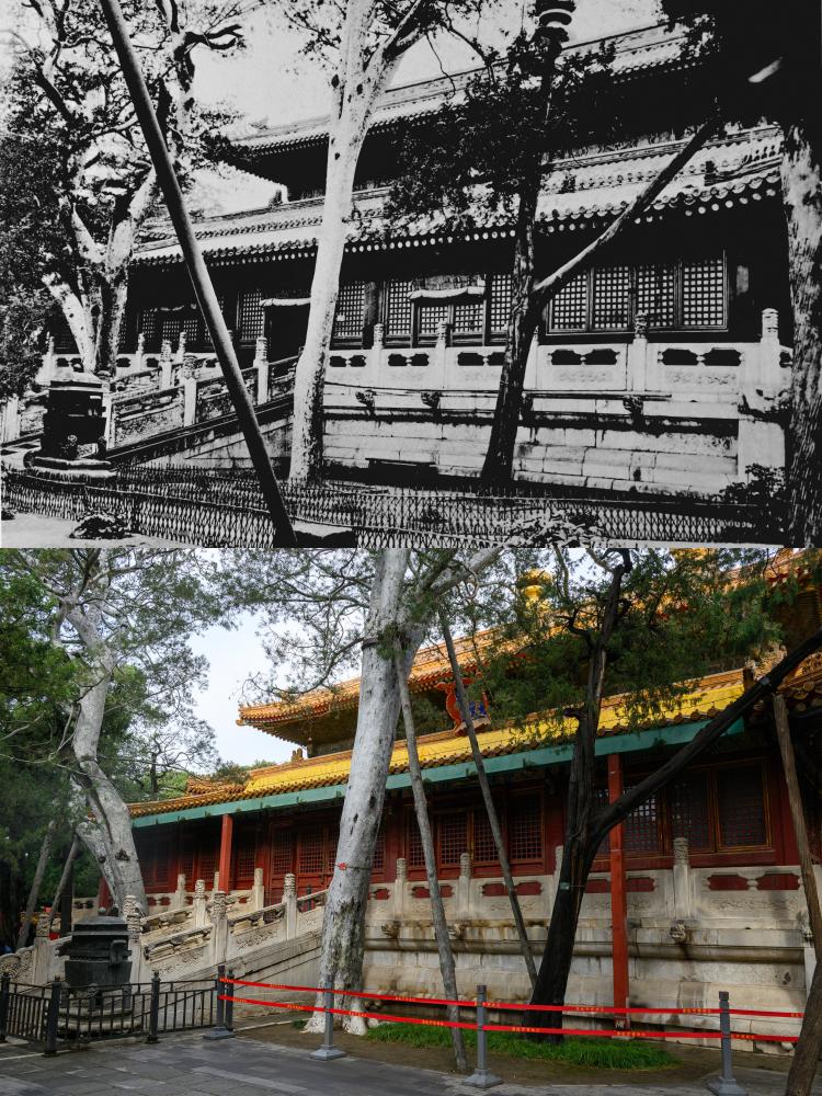 上:1920年代の欽安殿。(北京=新華社配信) 下:10日、故宮博物院の欽安殿。(北京=新華社記者/金良快)