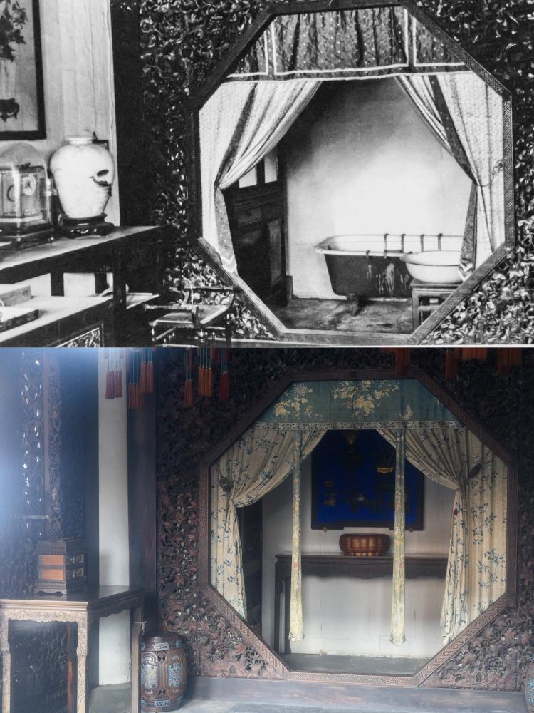 上:1920年代の儲秀宮の内部。(北京=新華社配信) 下:10日、故宮博物院の儲秀宮の内部。(北京=新華社記者/金良快)