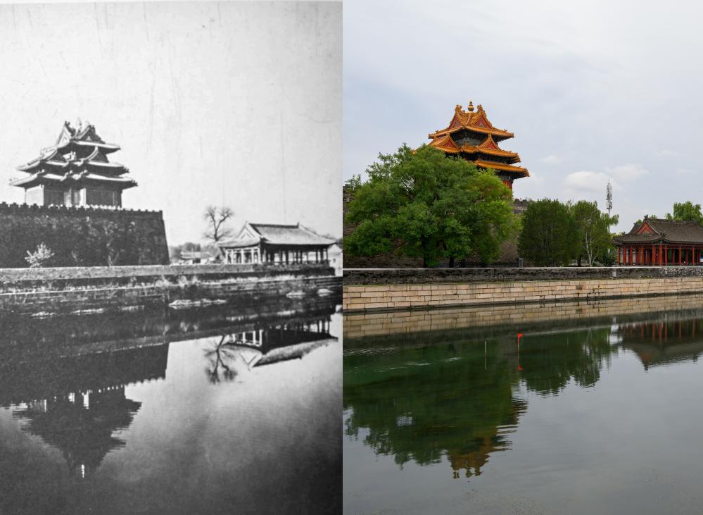 左:20世紀初頭の角楼。(北京=新華社配信) 右:10日、故宮博物院の角楼。(北京=新華社記者/金良快)