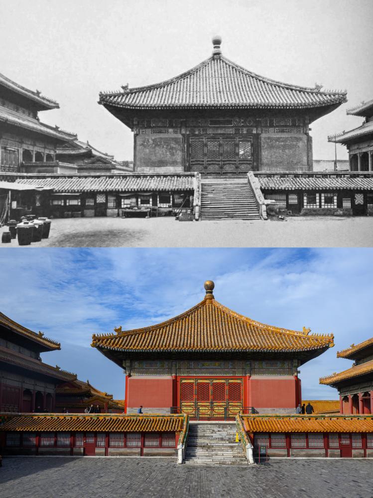 上:20世紀初頭の中和殿。(北京=新華社配信) 下:10日、故宮博物院の中和殿。(北京=新華社記者/金良快)