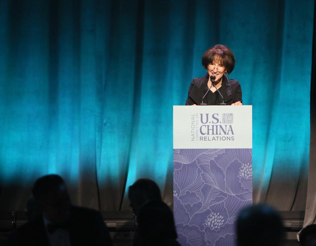 14日、米中関係全国委員会の年次表彰晩餐会であいさつするオーリンズ会長。(ニューヨーク=新華社記者/張鳳国)