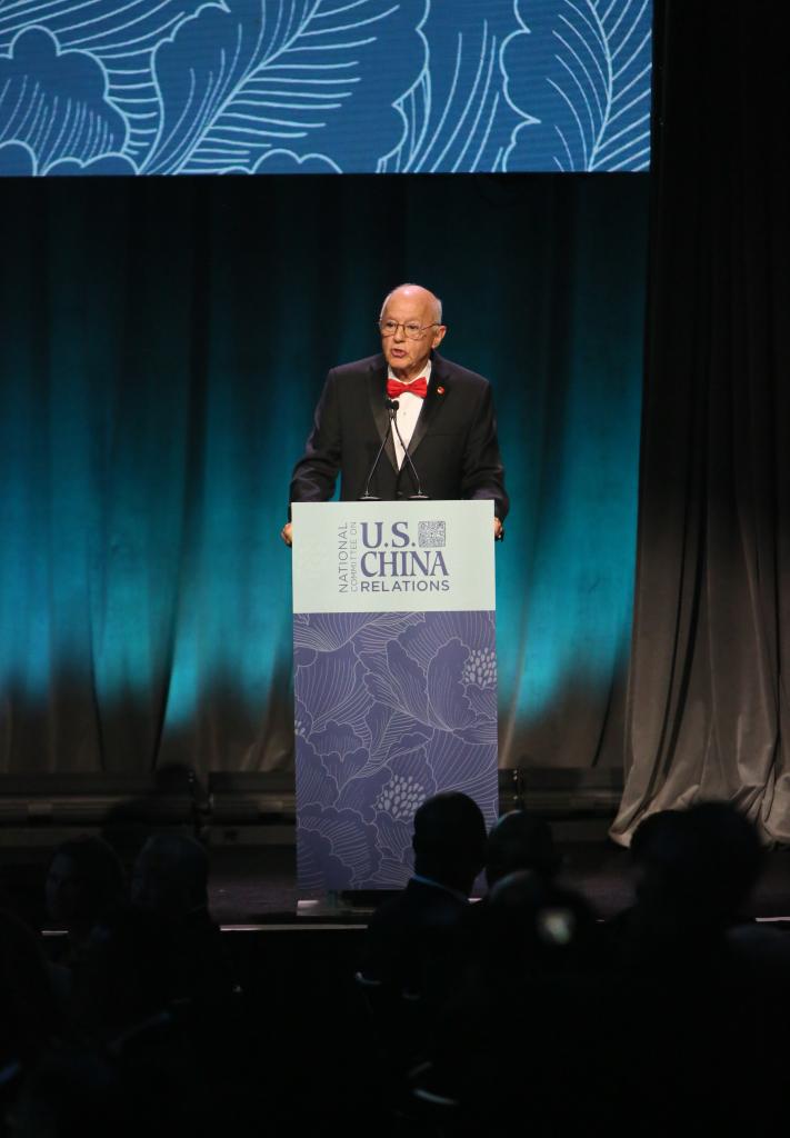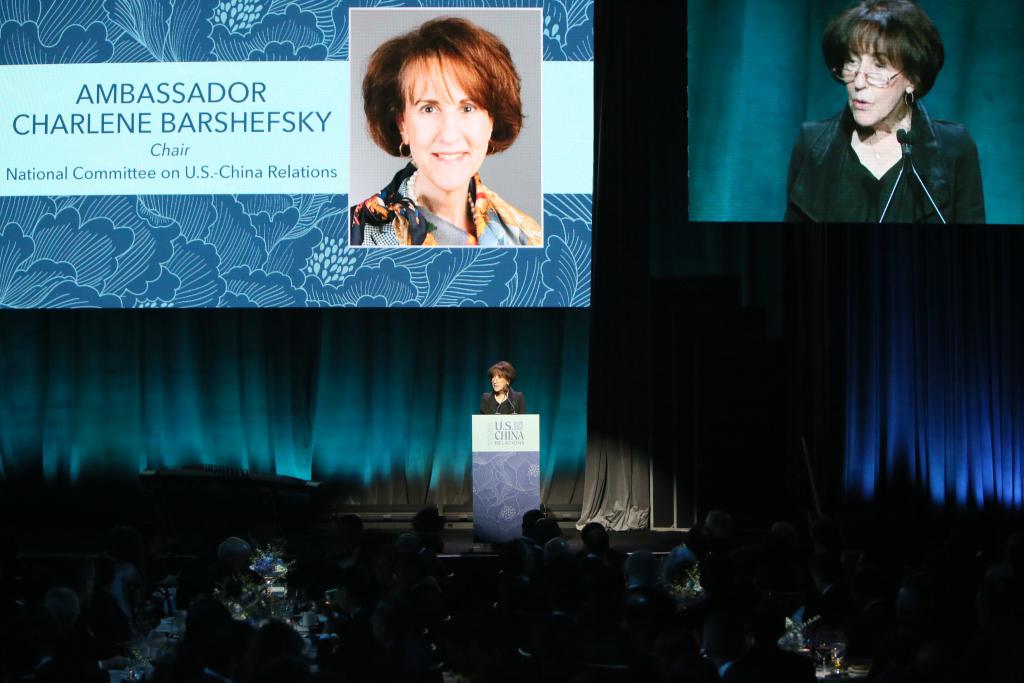 14日、米中関係全国委員会の年次表彰晩餐会であいさつする理事会議長で元米通商代表部(USTR)代表のバーシェフスキー氏。(ニューヨーク=新華社記者/張鳳国)