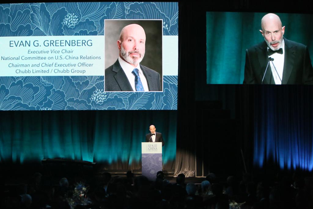 14日、米中関係全国委員会の年次表彰晩餐会であいさつするグリーンバーグ理事会副議長。(ニューヨーク=新華社記者/張鳳国)